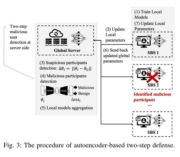 3. Flag anomalies based on reconstruction error:Ei​=∥θilocal​−f2​(f1​(θn​))∥2If Ei​ exceeds the average, the model is flagged as malicious.