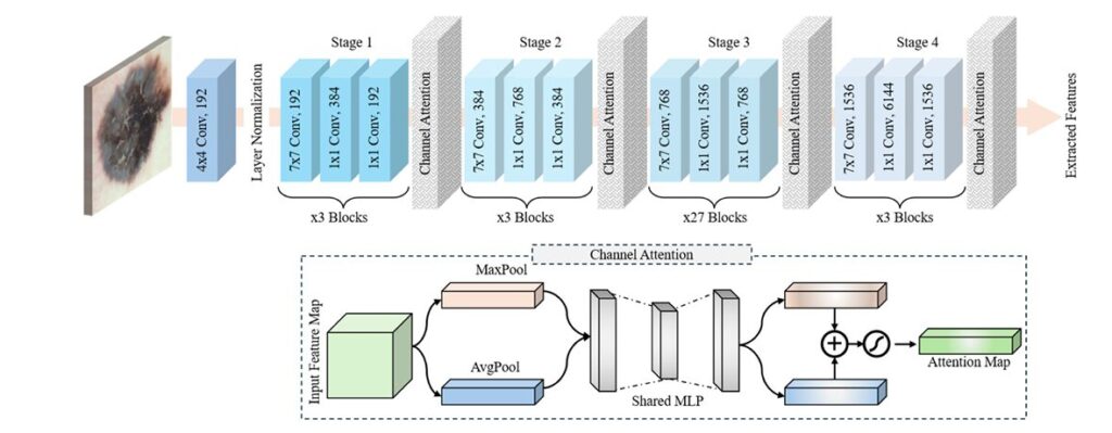 - Channel Attention Modules (CAM) after each stage to emphasize diagnostically relevant regions