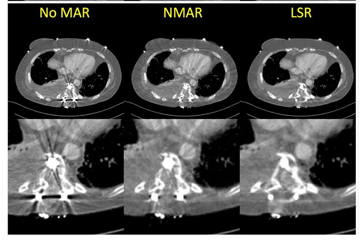 Image Description: Figure 5 shows three side-by-side comparisons for two different patients with metal implants: “No MAR,” “NMAR,” and “LSR.” The LSR images clearly show reduced streaking and improved visibility of surrounding tissues.