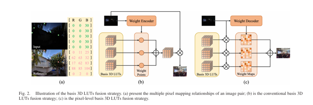LLF-LUT++ solves this through a pixel-level fusion strategy that first performs trilinear interpolation with multiple basis LUTs, then fuses results using content-dependent weight maps: