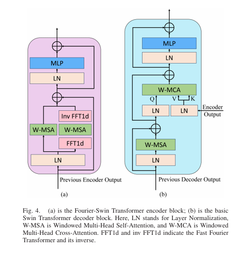 - Four Fourier-Swin Transformer blocks processing spatial and spectral information separately