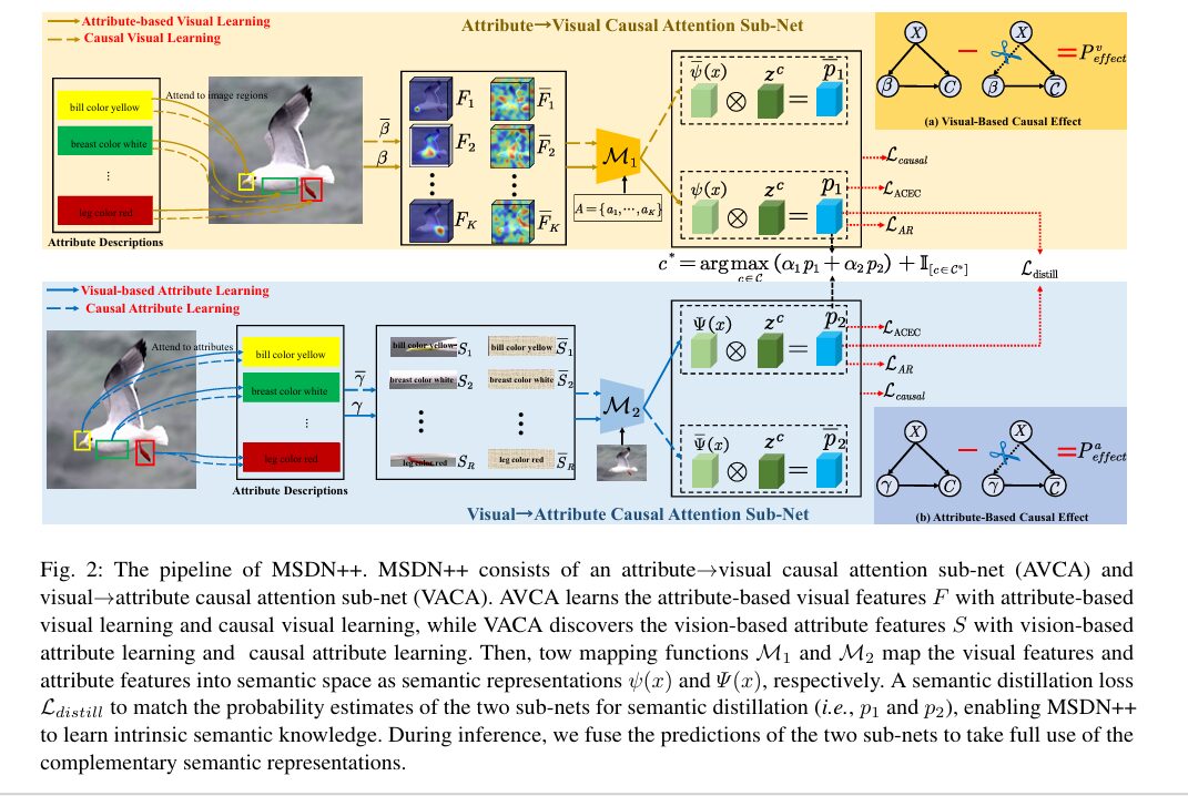 MSDN++ is built around two complementary attention sub-networks. The first, AVCA (Attribute→Visual Causal Attention), asks: for each semantic attribute, which image regions are most relevant? The second, VACA (Visual→Attribute Causal Attention), runs the problem in the opposite direction: for each image region, which attribute descriptions does it most support? Both sub-nets share a ResNet101 visual backbone and GloVe attribute embeddings, but learn entirely different attention patterns.