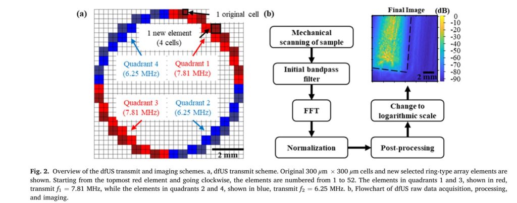 The researchers used a standard 32×32 2D matrix array probe with a center frequency of 7.5 MHz. Instead of using all 1024 elements independently, they grouped four adjacent 300×300 μm cells to form a single, larger element. From these newly formed elements, they selected 52 to create a ring-shaped array. This ring was then divided into four quadrants, each containing 13 elements.