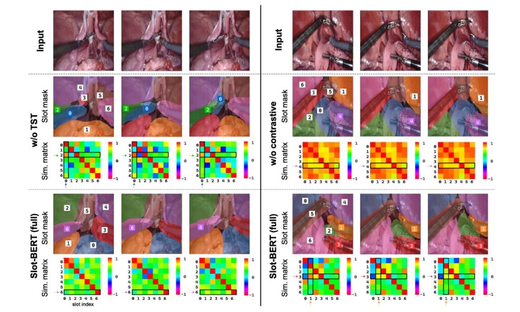 These metrics confirm that Slot-BERT doesn’t just segment objects accurately—it maintains consistent identity tracking across time, a crucial capability for surgical workflow analysis.