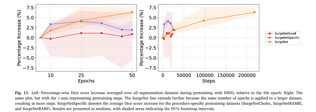 Traditional deep learning often exhibits convergence plateaus—training continues but produces minimal improvement. Surgical SSL behaves differently. SurgeNet continued yielding improvements throughout the 50-epoch training period, with no evidence of convergence (Fig. 11). This suggests that substantially longer training—potentially 100+ epochs—could yield additional performance gains.